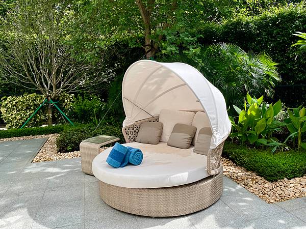 室外泳池的部份與外面的花園連接環境(不互通)