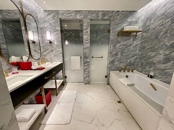 浴室部份,包括了五星級酒店標配的雙洗手盤