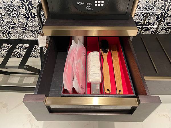 保險箱下方的抽屜整齊擺放着拖鞋,擦鞋用品和洗衣袋等物品