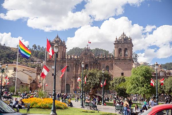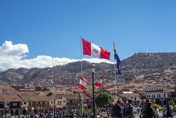 我們的旅程期間適逢秘魯國慶,在廣場中飄揚着多面秘魯國旗和庫斯科市旗彩虹旗🏳️🌈